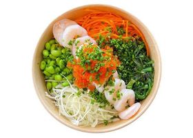 Riz basmati, crevettes, carottes, wakamé, edamame, choux blancs, tobiko et ciboulette.
