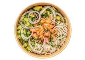 Riz, saumon, avocat, concombres, choux blancs, oignons rouges, graines de sésame, ciboulette et sauce au choix.