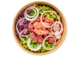 Quinoa, thon albacore, avocat, edamame, choux rouges, radis, gingembre gari, oignons frais et sauce au choix.