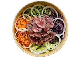 Riz basmati, Tataki de bœuf, Edamame, Chou rouge, Carotte, Concombre, Graines de sésames, Oignon cru