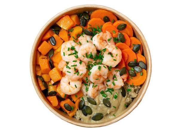 Quinoa, crevettes du chef, courge, carottes, caviar d'aubergines, graines de courge et ciboulette.