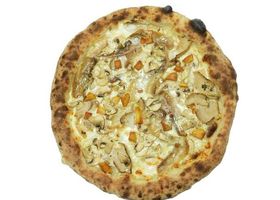 Mozzarella, porchetta di ariccia "cochon de lait rôti", pommes de terre, Taleggio DOP, champignons frais et ciboulette.