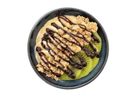 Yaourt grec, banane, kiwi, muesli crunchy et coulis de chocolat.